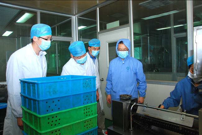 清华控股总裁周立业(中)参观公司固剂生产车间