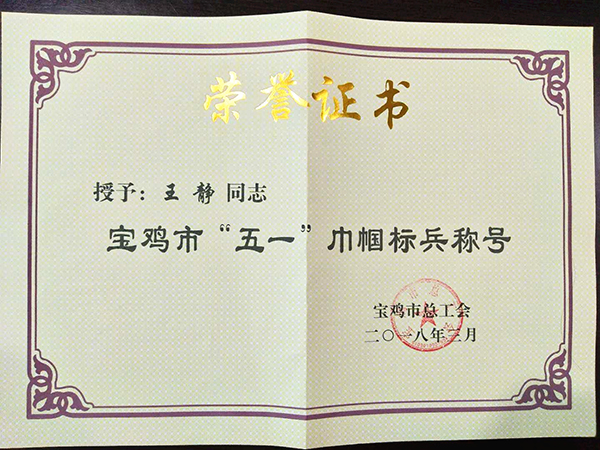 按照全国、省、市总工会2018年工作部署,为了总结2017年工会女职工工作,表彰先进集体、新进个人,大力弘扬劳模精神和工匠精神,进一步团结动员广大女职工为宝鸡加快建设最具幸福感城市做出新贡献。宝鸡市总工会于2018年3月7日召开纪念“三八”国际劳动妇女节108周年暨表彰大会。 上午9点,表彰大会准时召开。在此次表彰大会上,我公司党总支副书记、团委书记、总经理助理王静同志在众多优秀代表中脱颖而出,荣获宝鸡市“五一”巾帼标兵称号。 近年来,王静同志肩负着公司对外发展中各个环节的“桥梁”作用,她用智慧和执着为企业和外部环境搭建了一条条快捷通道。于内完善公司各项规章制度,加强企业凝聚力、向心力,提高员工工作、生活质量。于外宣传展示公司文化软实力,提高公司对外形象、知名度。作为公司高管,她平易近人,温柔知性,在政府各职能部门以及公司广大职工心目中塑造出完美的管理者形象,为公司快速健康发展做出了不凡的贡献。