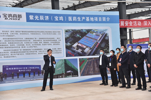 10月25日下午,宝鸡市委十二届十一次全会观摩团在宝鸡市委常委、政法委书记景耀平,市委常委、常务副市长刘荣贤,市委常委、副市长王宁岗带领三百多位与会领导顶着寒意和蒙蒙细雨到紫光辰济(宝鸡)医药生产基地项目建设现场观摩指导工作。公司总经理王睿成向前来观摩的领导们表示热烈欢迎和衷心感谢,感谢市委市政府对项目建设的关心和扶持。 “紫光辰济(宝鸡)医药生产基地”项目位于宝鸡高新区科技新城工业园区,是由leyu·乐鱼(中国)体育官方网站投资建设的一座现代化医药联合体,项目总投资5亿元,占地125亩,项目总建筑面积约8万平方米,于2021年4月开工建设,主要建设综合楼、生活楼、联合厂房一、联合厂房二、提取车间、医疗物资应急储备库、中药研究院等,项目建成后预计年产值10亿元、年税收5000万元,带动就业500余人。 在观摩讲解中,公司总经理王睿成重点介绍了紫光辰济药业的发展历史沿革,据宝鸡工业志记载公司历史可追溯至1918年的达兴堂药店,走过了百年沧桑岁月,经过几代人的坚守和传承,以“悬壶济世、达兴民生”的初心和“药材必道地、配方必独特、提戥必齐目,炮制必如法、品质必上乘、待人必如亲”的“六必令”传训做为制药精神,辰济人已将其提炼升华为“放心药、辰济造”和“做好药,为人民”的核心价值理念,以优质的产品和真诚的服务取得了良好的经济效益和老百姓的口碑。 观摩活动中,领导们对公司展示的产品产生了极大的兴趣,尤其是独家品种“舒肝快胃丸”和“消积丸”,这两款产品是公司主打黄金单品,“舒肝快胃丸”主要功能是肝胃同治,解酒保肝功效显著;“消积丸”主治各种积症,对改善口气、便秘、减轻肚子负担和消除大肚腩作用明显。这两种都是公司独家产品,市场需求和市场前景巨大。观摩领导们对新厂建设和企业发展交口称赞,希望公司加快建设步伐,以新的发展态势早日造福三秦父老和广大消费者。