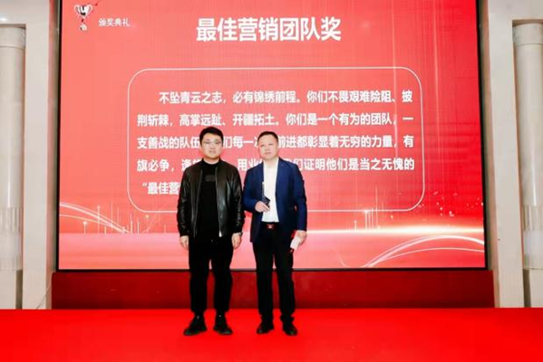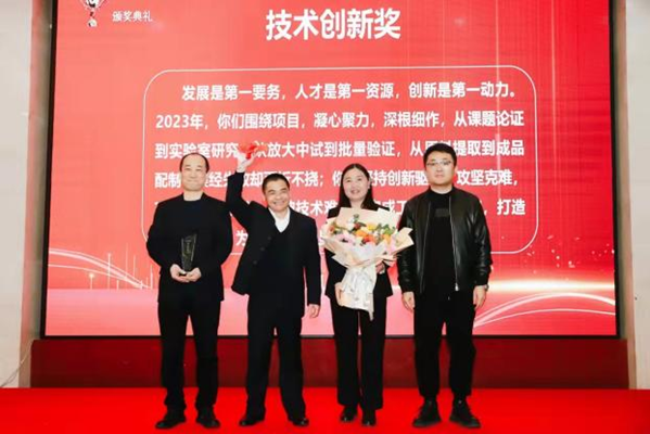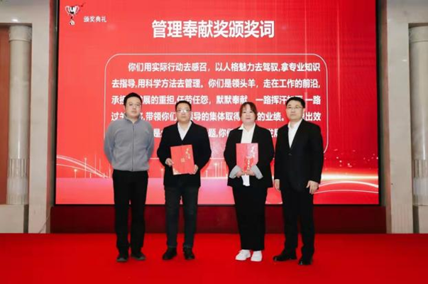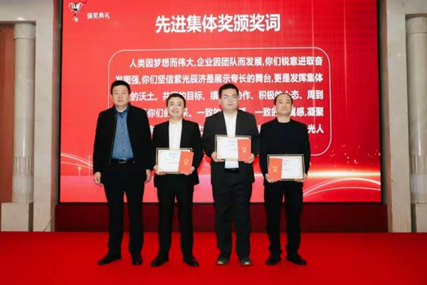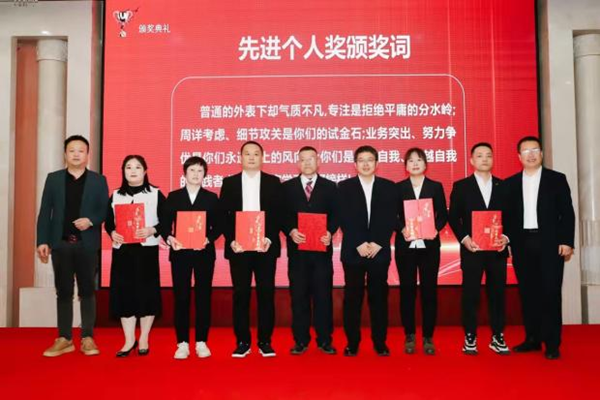 在听取完各部门工作述职后,公司总经理冯建利代表公司全面总结了2023年的工作情况,回顾了公司在过去一年中取得的成绩和面临的挑战。他在讲话中说道:“公司的发展离不开每一位员工的辛勤付出和努力,2023年对紫光辰济来说是极为不平凡的一年,面对复杂多变的改革形势,全体辰济人逆势前行,勇毅奋斗,在变化中逐风搏浪,在风雨中砥砺前行,交出了一份饱含智慧与汗水的靓丽答卷。”在安排部署2024年工作计划时,公司总经理冯建利强调:美好未来,奋斗以成。展望2024年,新的时代已经向我们开启,无限的可能均在无畏的奋斗中出现。号召公司全体干部职工要咬定2024年工作要点的目标,坚持稳中求进保存量,先立后破促增量的经营方针,以生产经营为中心,以新线建设为重心,以制度建设为抓手,持续深化内部改革,强化基础管理,合理配置资源,不断提升技术创新水平、本质安全水平和运营管理水平,为紫光辰济药业持续、健康、高质量发展奠定坚实基础。 在表彰环节,公司对在2023年度工作中表现突出的个人和集体进行了表彰嘉奖,向荣获高级职称的三位管理干部颁发了企业聘书。获得表彰的先进代表和受聘代表分别作了表态发言,整个颁奖环节将大会现场气氛推向高潮。