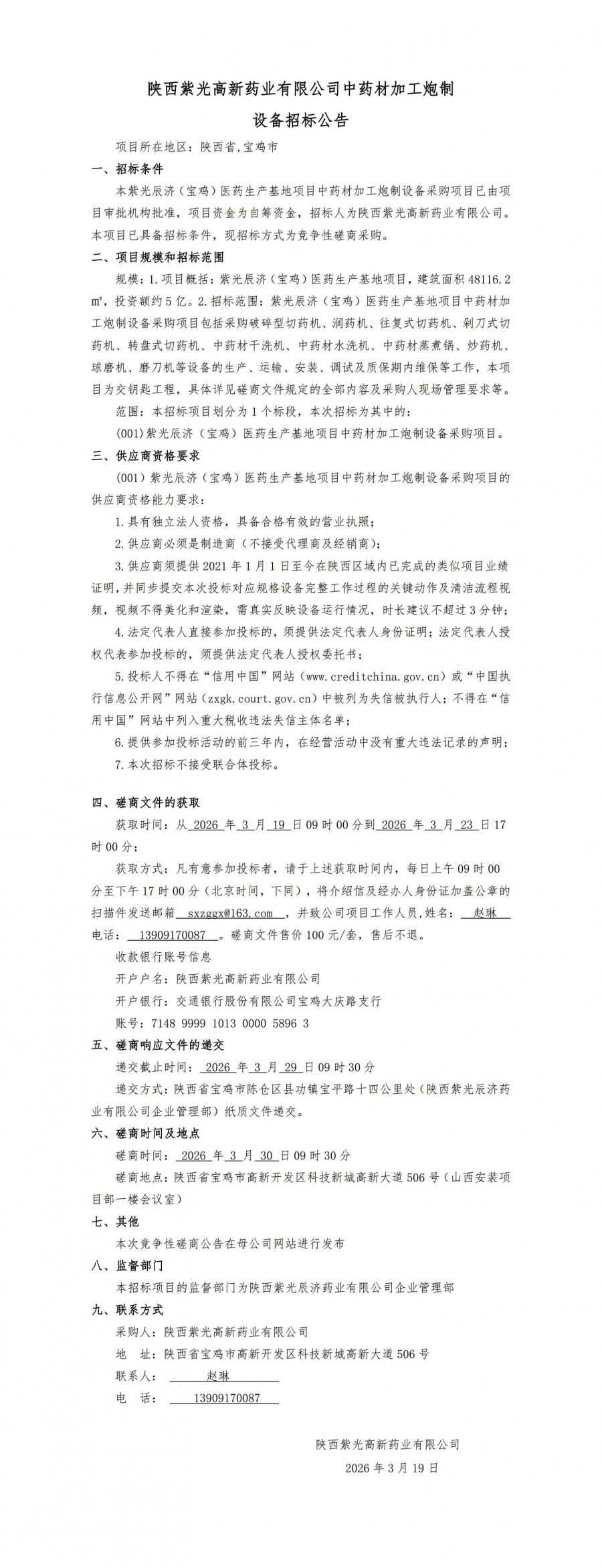 陕西紫光高新药业有限公司中药材加工炮制设备招标公告