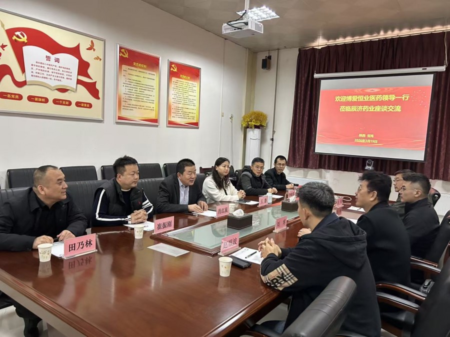 2026年3月19日,博爱恒业医药领导一行莅临辰济药业进行实地考察与座谈交流。会议在辰济药业会议室隆重举行,双方就各自企业的发展历程、核心优势及未来规划进行了深入交流。